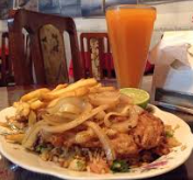 1/2 Arroz frito con huevo y jamón, pechuga y un fresco del día (té frio) en bolsa.