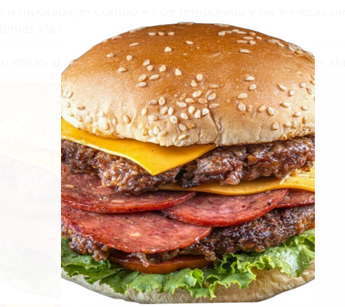 2 tortas de carne, 2 lonjas de queso amarillo, pepperoni, lechuga y tomate fresco y salsa mil islas