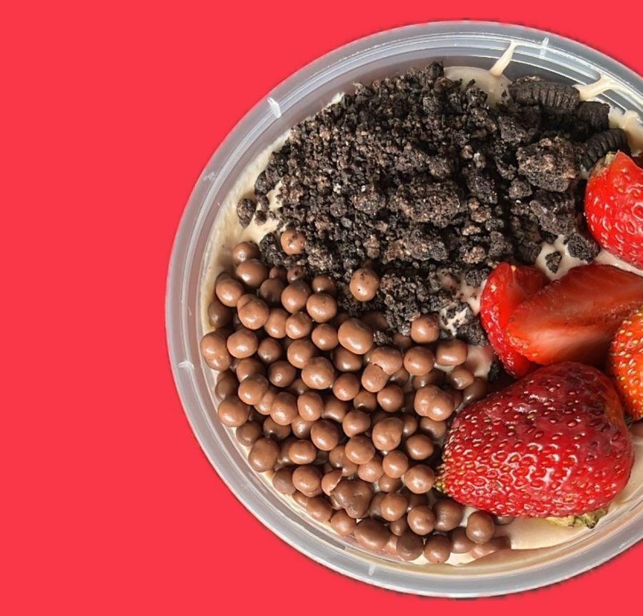 Base fresa con crema de chocolate y solamente 3 toppings a elegir. Vaso de 9 onzas
