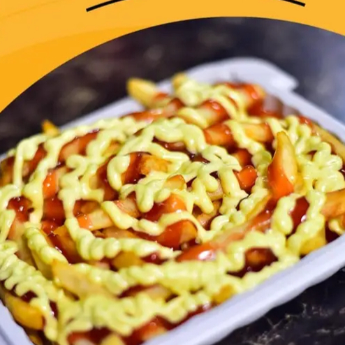 Orden pequeña de salchipapas con salsa de tomate y mayonesa.