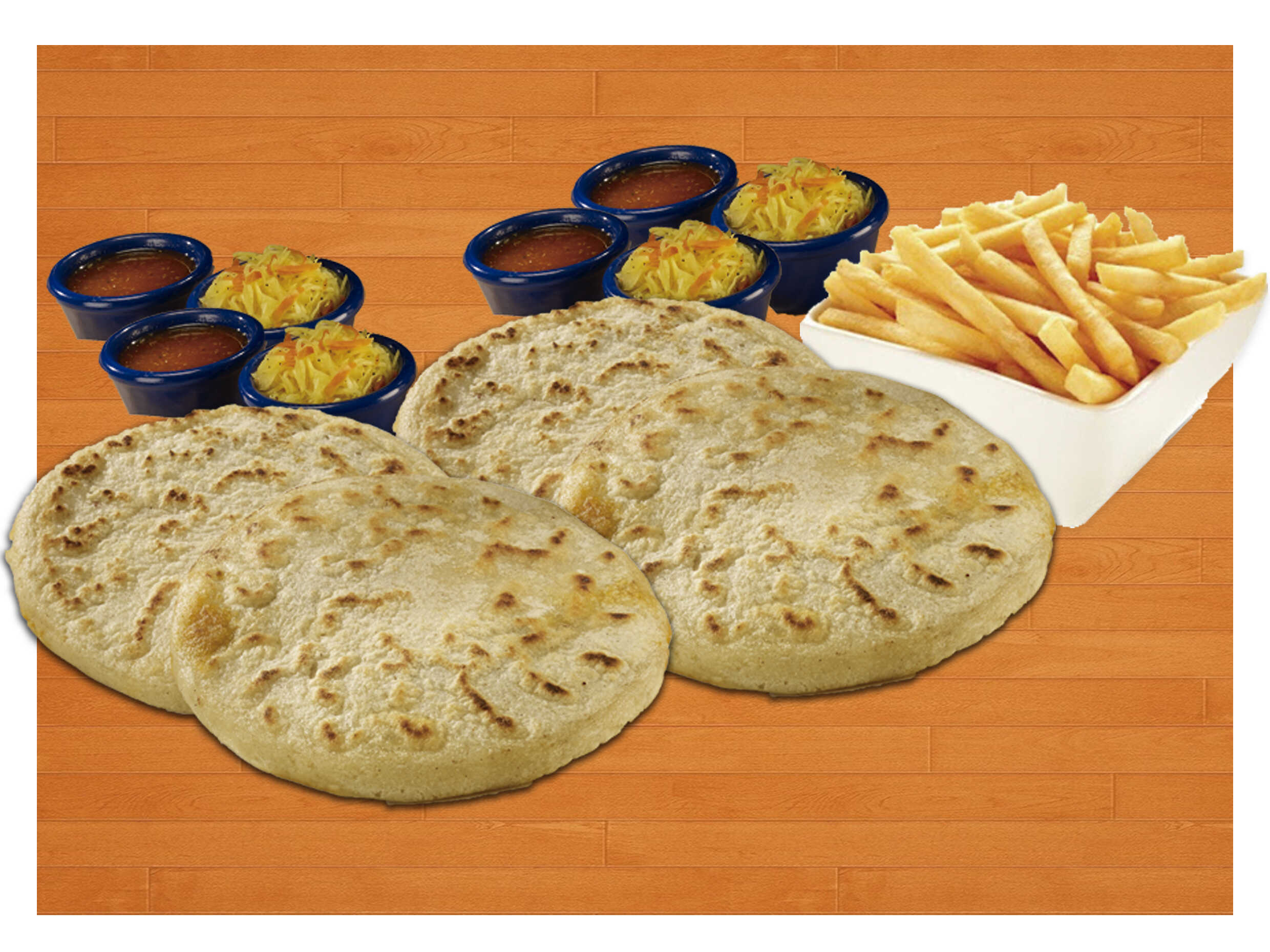 4 Pupusas mixtas grandes, 4 encurtidos , 4 salsas más papas grandes.