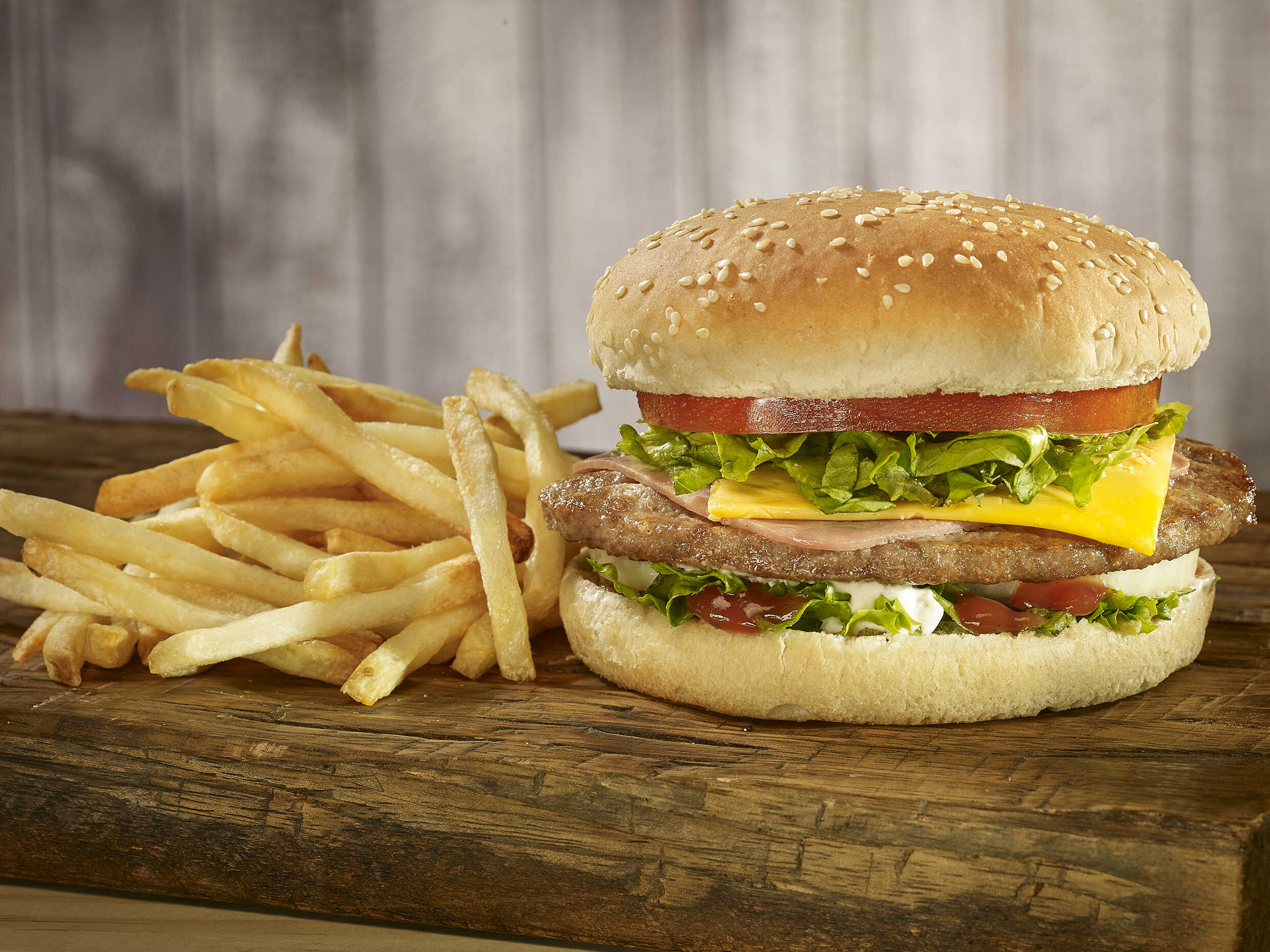 Hamburguesa 1/4 libra especial con papas y bebida de natural 16 oz.