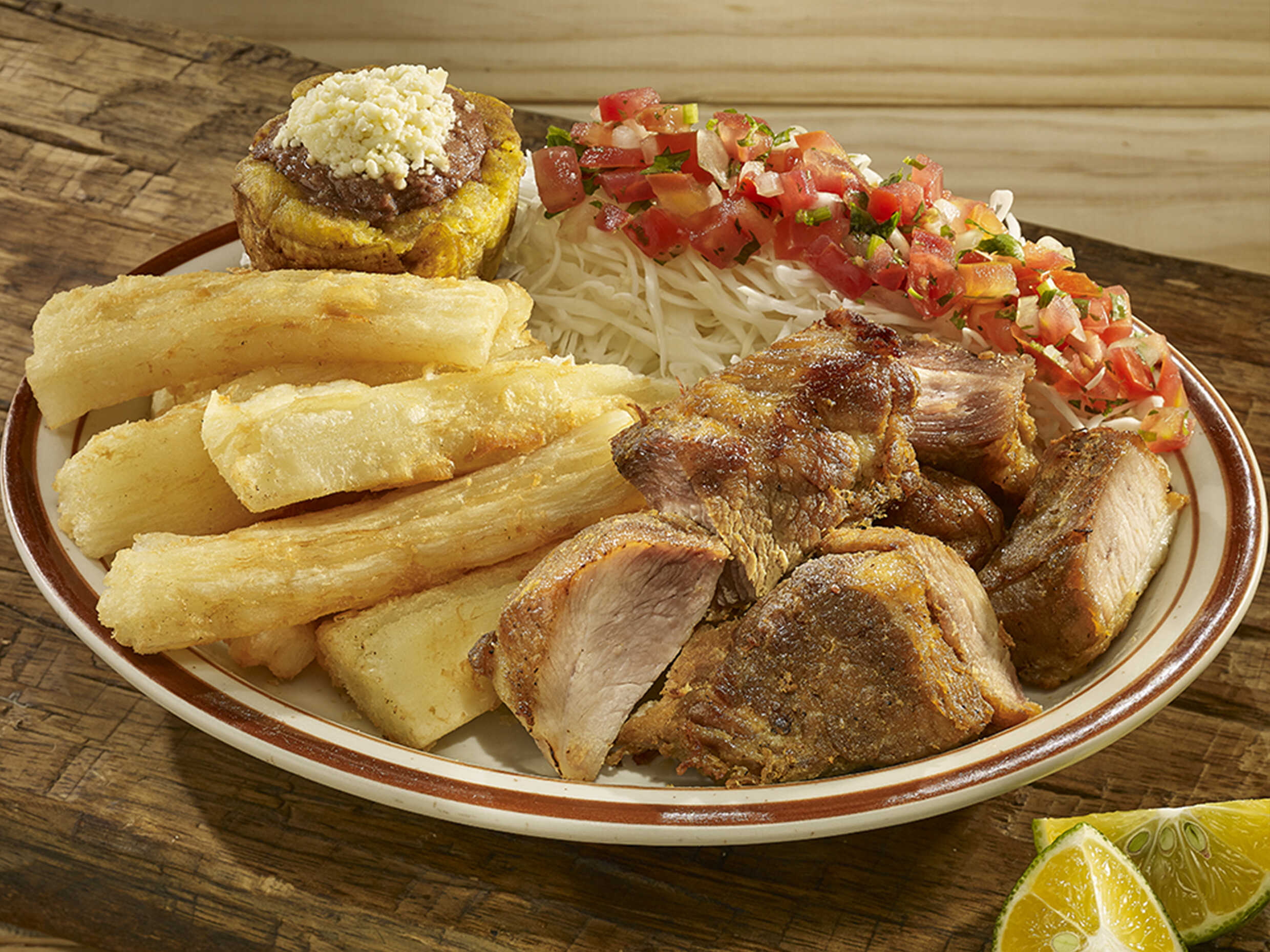350g de carne de cerdo, yuca frita, repollo, pico de gallo, patacón con frijol y queso y limones.