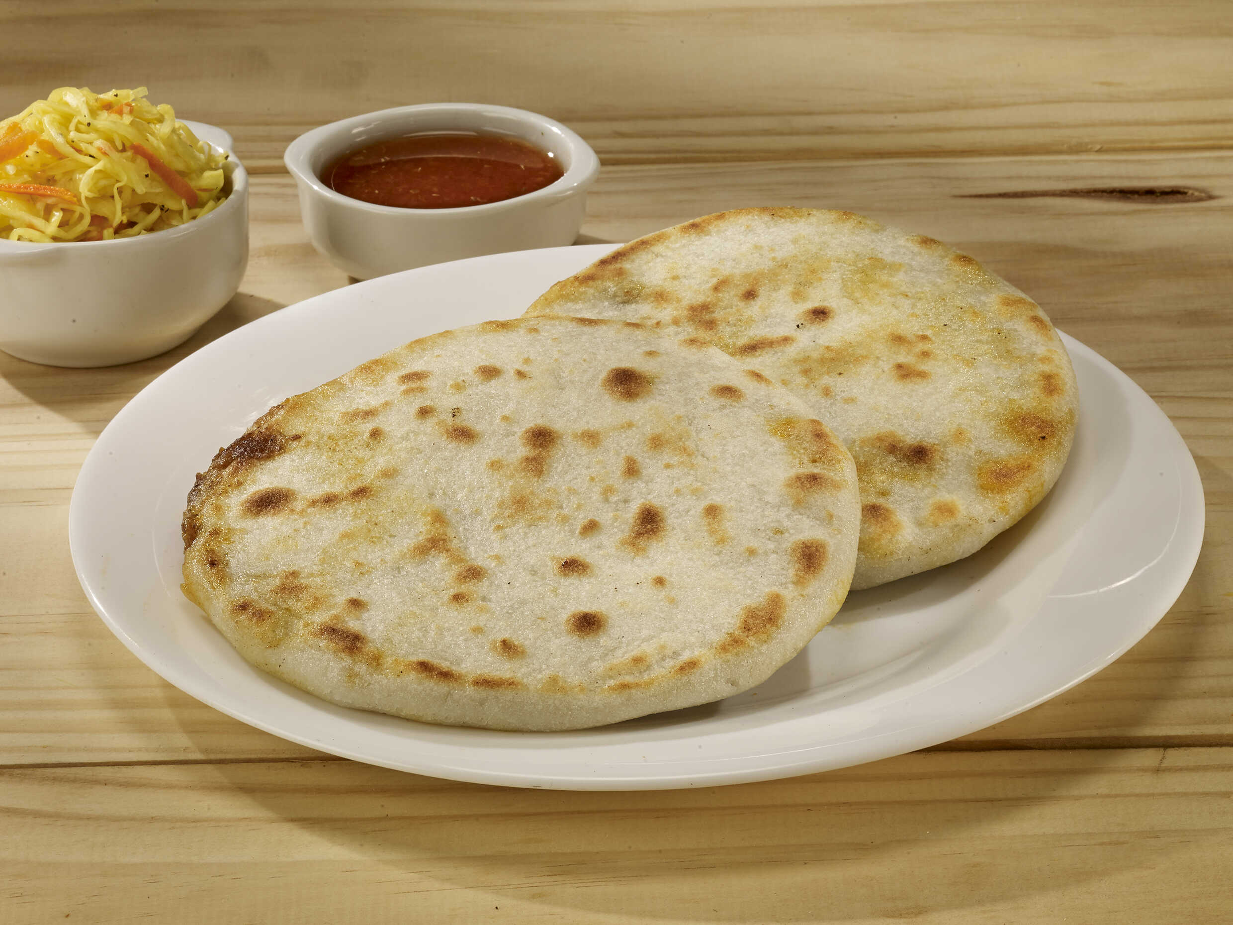 Dos pupusas de masa de arroz mixtas rellenas de queso frijol y chicharrón con encurtido, salsa y bebida natural 16 oz.