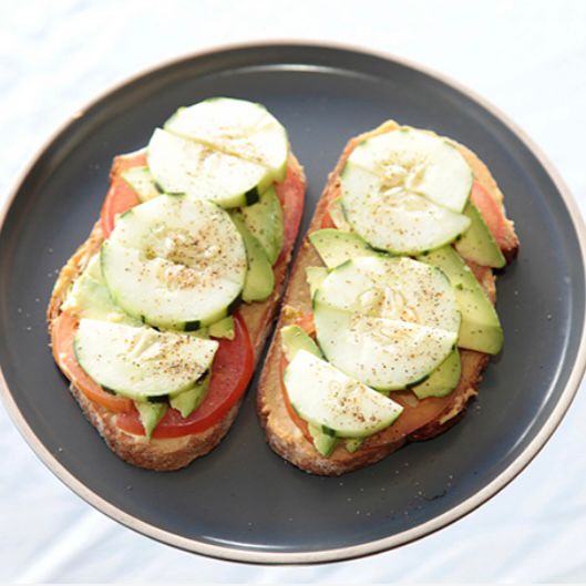 Pan de masa madre con 2 rebanadas. Hummus, aguacate, tomate y pepino. Aplica restricciones, solo en San Antonio de Belén.