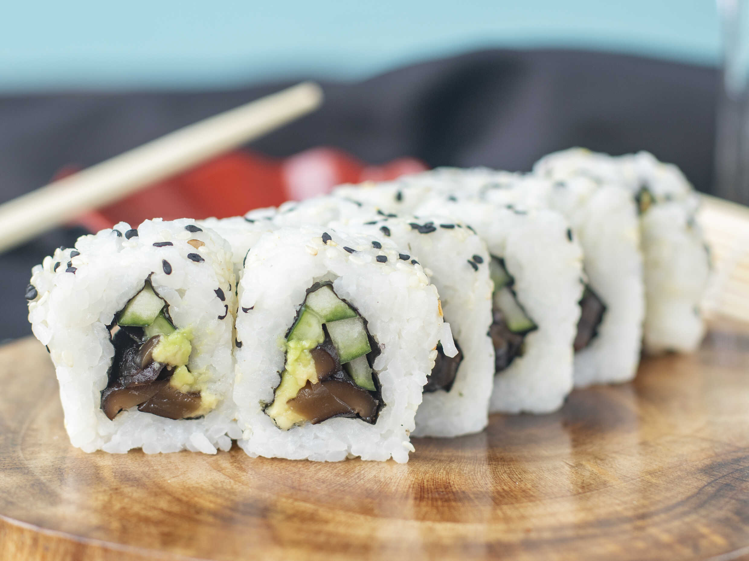 Relleno: hongo, pepino y aguacate. Cubierta: Ajonjoli