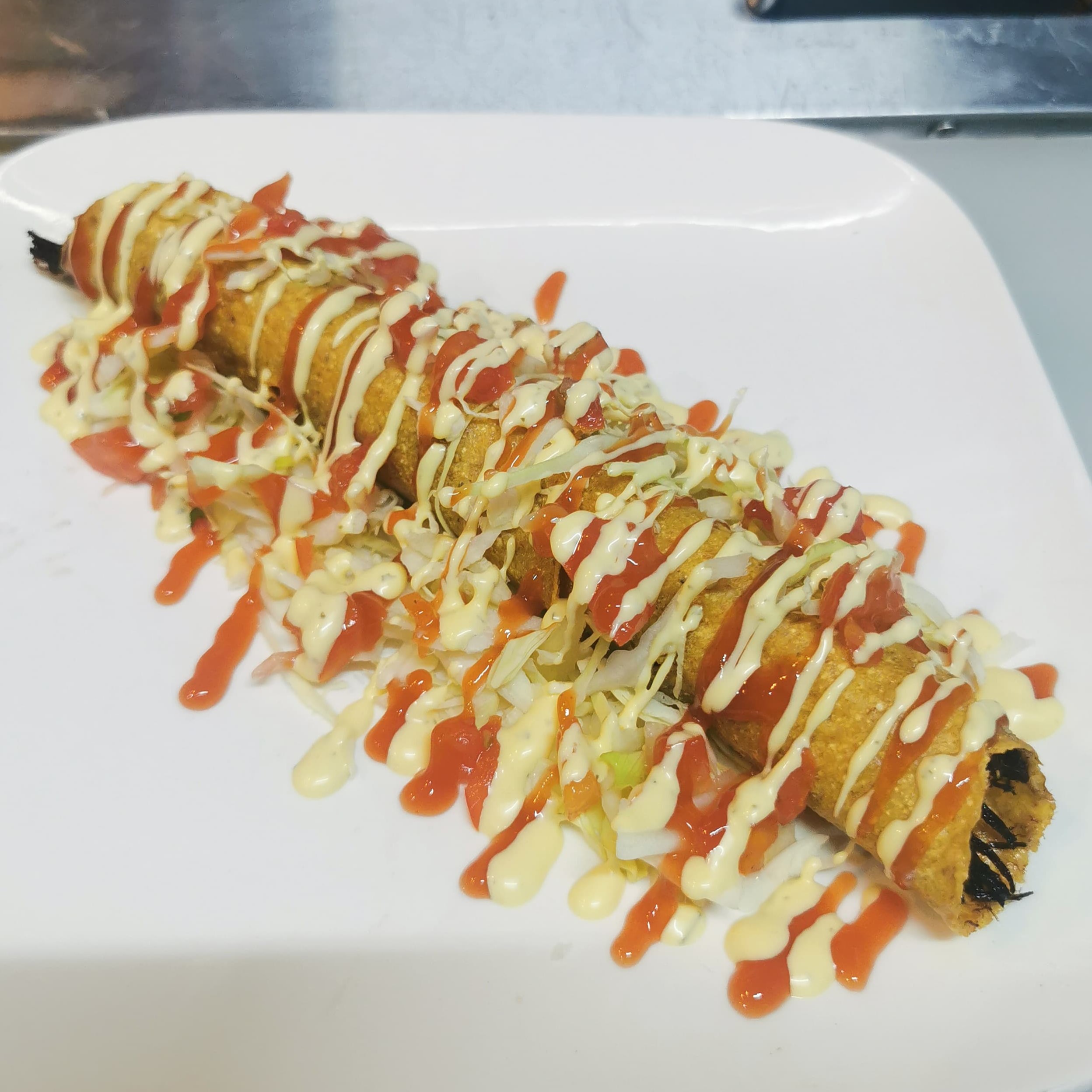 Tortillas de maíz fritas, relleno de carne, pico de gallo, salsa de queso, mayonesa especial y salsa de tomate.