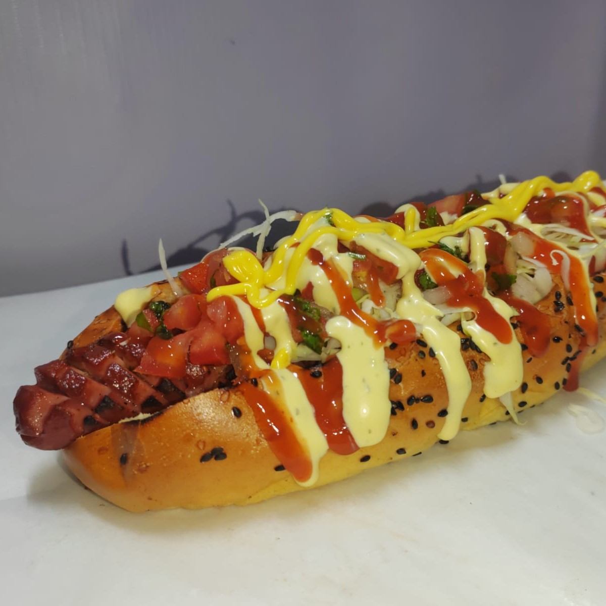 Hot dog de 22cm con lechuga, pico de gallo, pepinillos, queso cheddar, jalea de piña y salsas