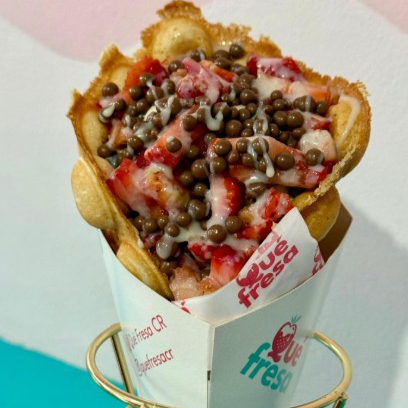 "¡Una explosión de sabor y texturas! 🧇 Nuestro Bubble Waffle en cono tipo burbuja viene con dos bolas de helado, fruta fresca (fresa o durazno), un topping a elegir y tu salsa favorita. ¡Una experiencia única! 🎉"