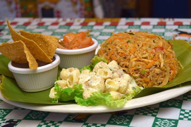 Chorizo, chuleta, bisteck, carne mechada, pollo, filet de pescado / Rice and beans with: sausage, steak, chicken, pork-chop, spicy meat or fish.