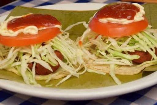 Para dos personas, De pollo, carne o chicharrón / Tortilla with smashed beans, chicken or meat, lettuce, ketchup and mayonnaise.