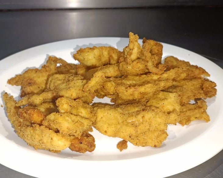 Pedacitos de pechuga de pollo tipo nuggets sin acompañamiento.