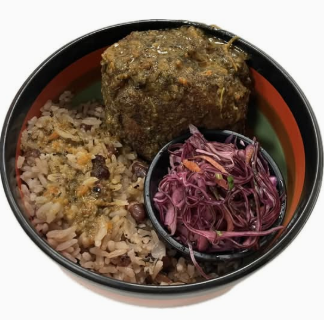 Rice & beans con albóndiga de plátano rellena de frijol y queso en salsa caribeña, acompañado de ensalada de repollo.