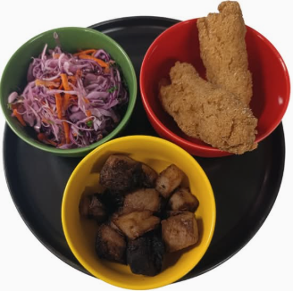 Mini rice and beans, nuggets de pescado en salsa caribeña, ensalada y patacones.