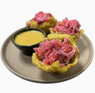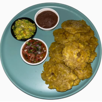 Orden de patacones de plátano verde con frijoles molidos y guacamole.