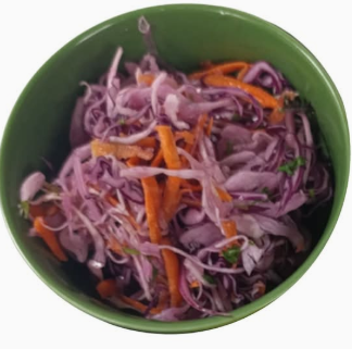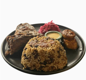 Rice and beans, pollo en salsa caribeña, ensalada de repollo, plátano maduro.
