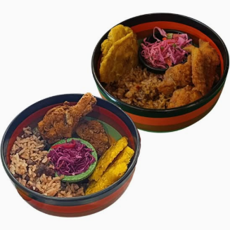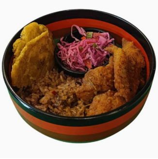 Bowl de rice & beans con pollo en salsa caribeña, patacones y ensalada de repollo.