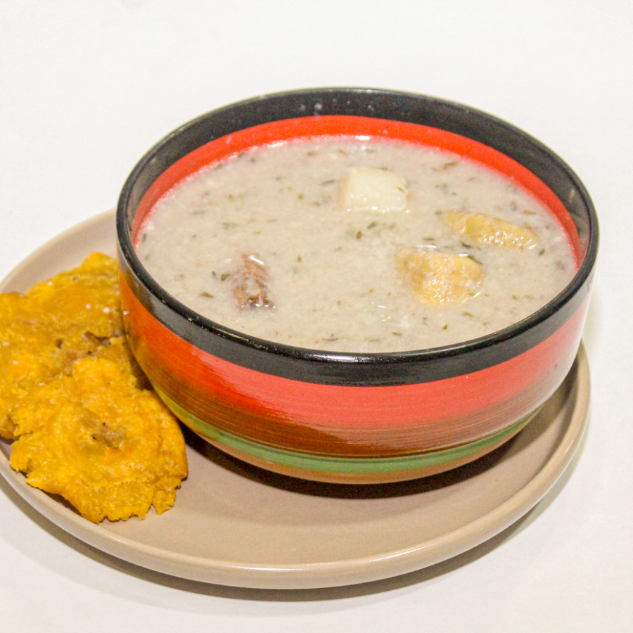 Sopa de pescado con tubérculos y leche de coco, acompañado por patacones
