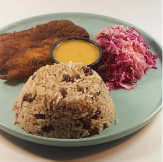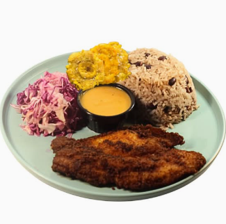Rice & beans con filet de pescado en salsa caribeña, acompañado de patacones y ensalada de repollo.