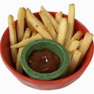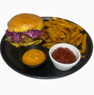 Filet de pechuga de pollo empanizada con salsa jerk BBQ acompañado de papas fritas.