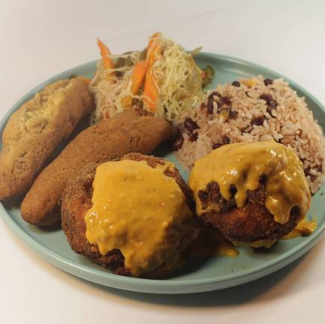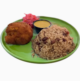 Mini rice and beans, albóndiga de plátano con salsa caribeña y ensalada.