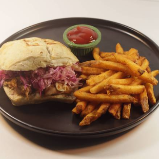 Pollo mechado en salsa caribeña, queso mozzarella, repollo y aderezo de la casa, incluye papas fritas.