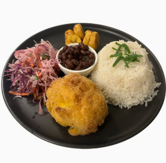 Albóndiga de plátano rellena de queso y frijoles acompañados de arroz, frijoles, maduros y ensalada.