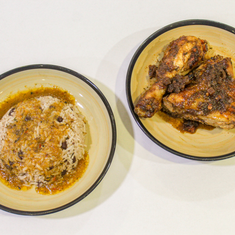 Rice & beans con cerdo en salsa jerk, acompañado de maduros y ensalada de repollo.