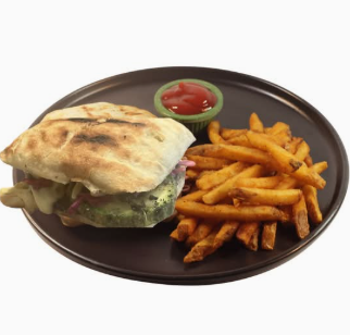 Berenjena y zucchini a la parrilla, vegetales salteados y queso mozzarella entre 2 panes ciabatta.