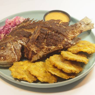 R&B, Fish Sticks de Tilapia en Salsa Jerk, Patacones, Pico de Gallo y Aguacate