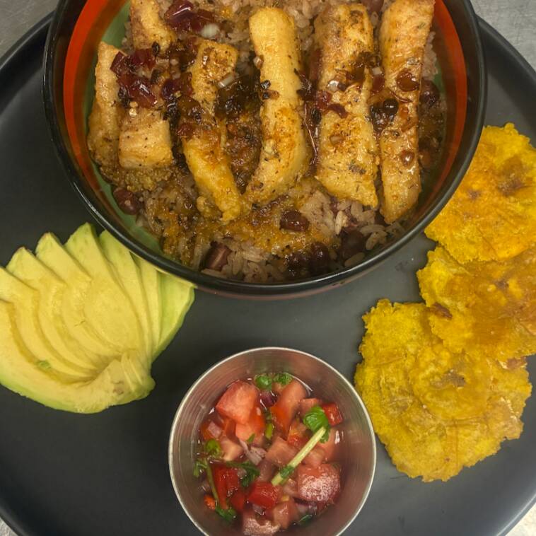 Rice and Beans, Pollo Jerk, Patacones, Pico de Gallo y Aguacate
