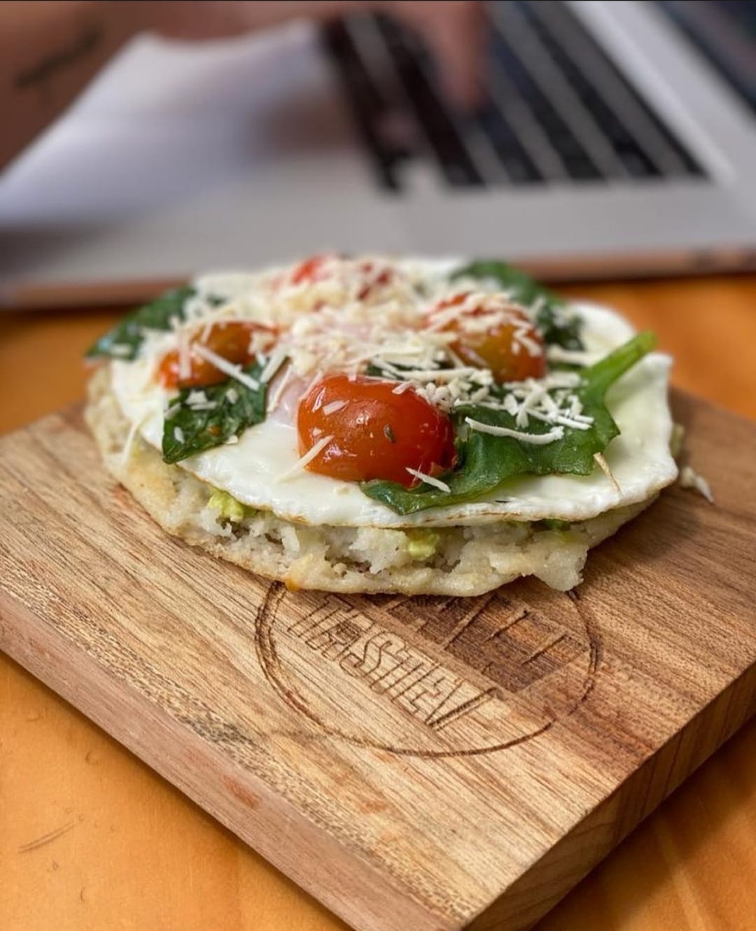 Tajada de pan integral, huevo frito, espinaca y tomate cherry, salteados en una cama de guacamole.