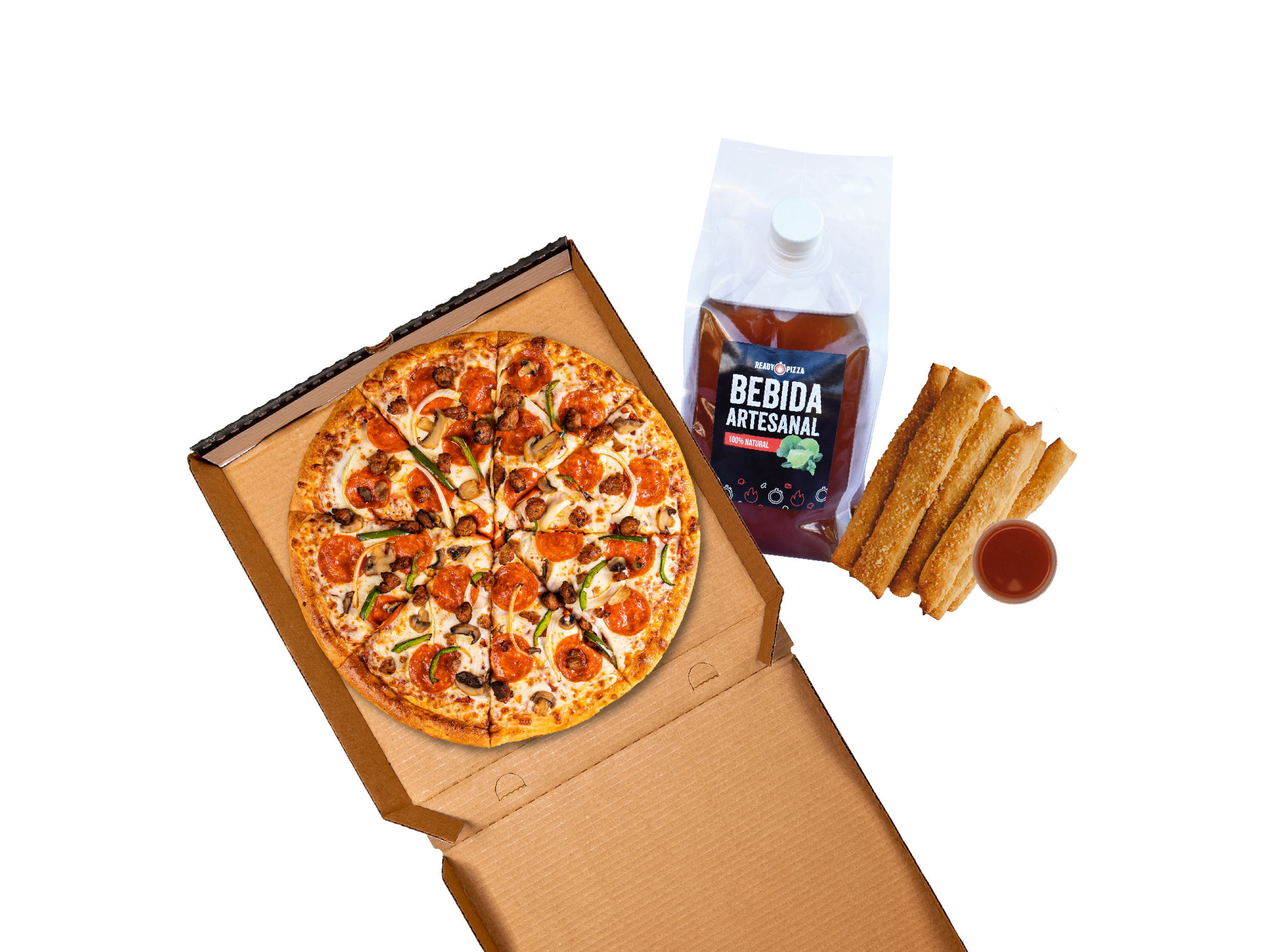 1 Pizza grande, 1 orden de Ready Breads y 1 bebida natural de 1.5 L.