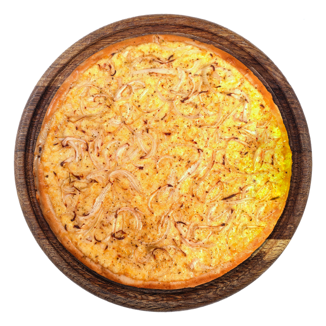 Pizza estilo argentina con cebolla y queso Monte Rico.