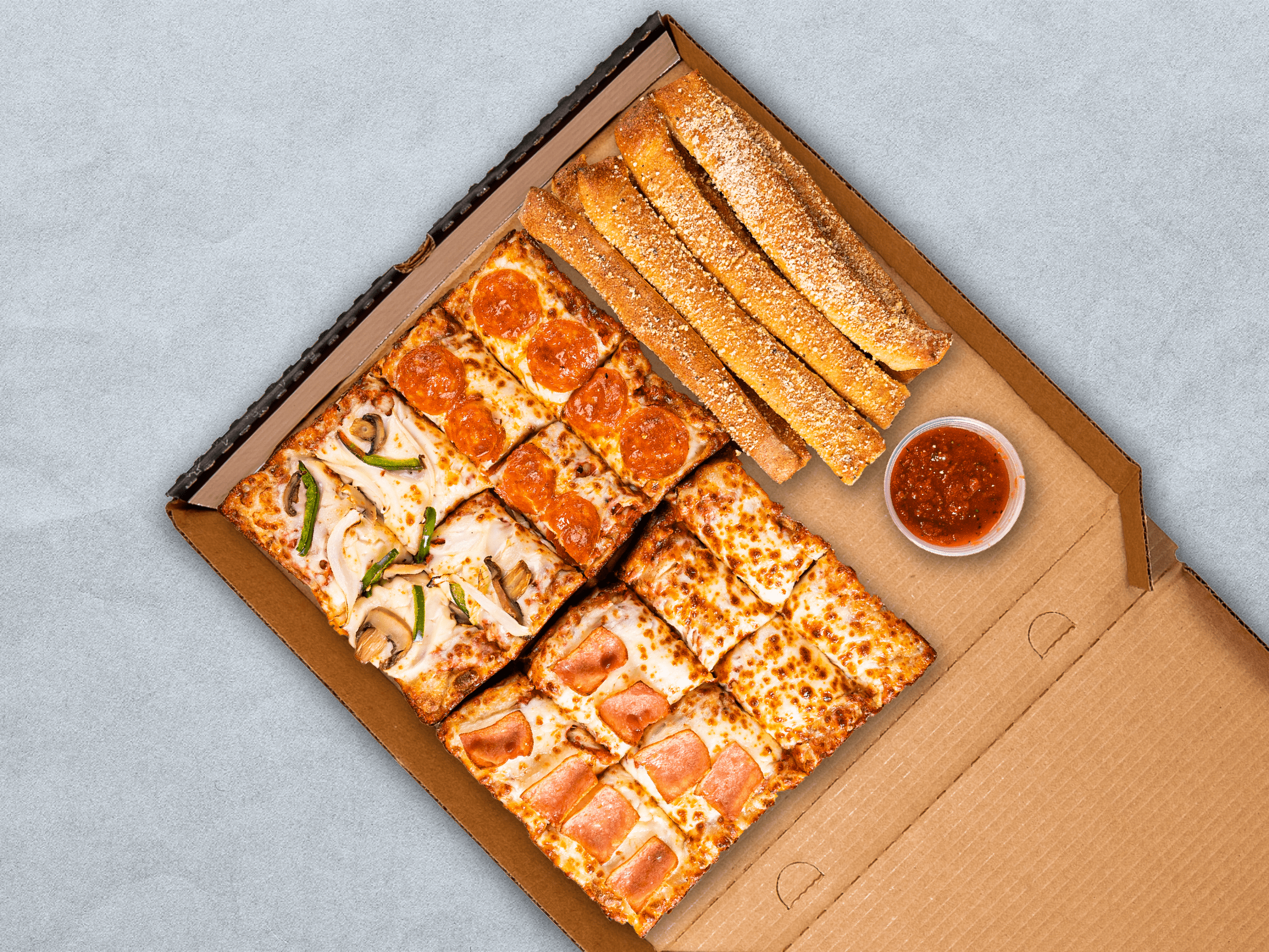 1 Pizza rectangular de 8 porciones. Acompañada de 1 orden de Ready Breads con su salsa de pizza.