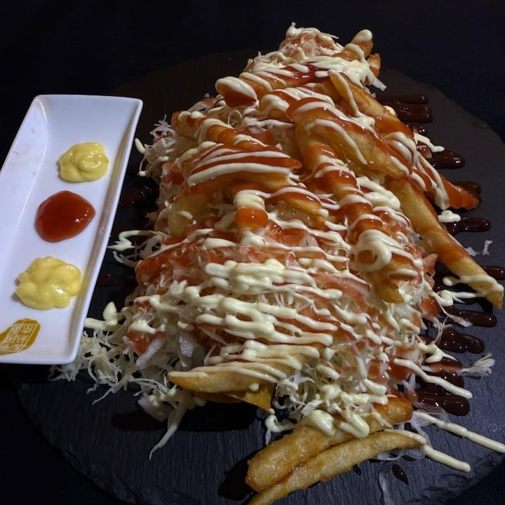 Papas fritas grandes con salsa de tomate y mayonesa.