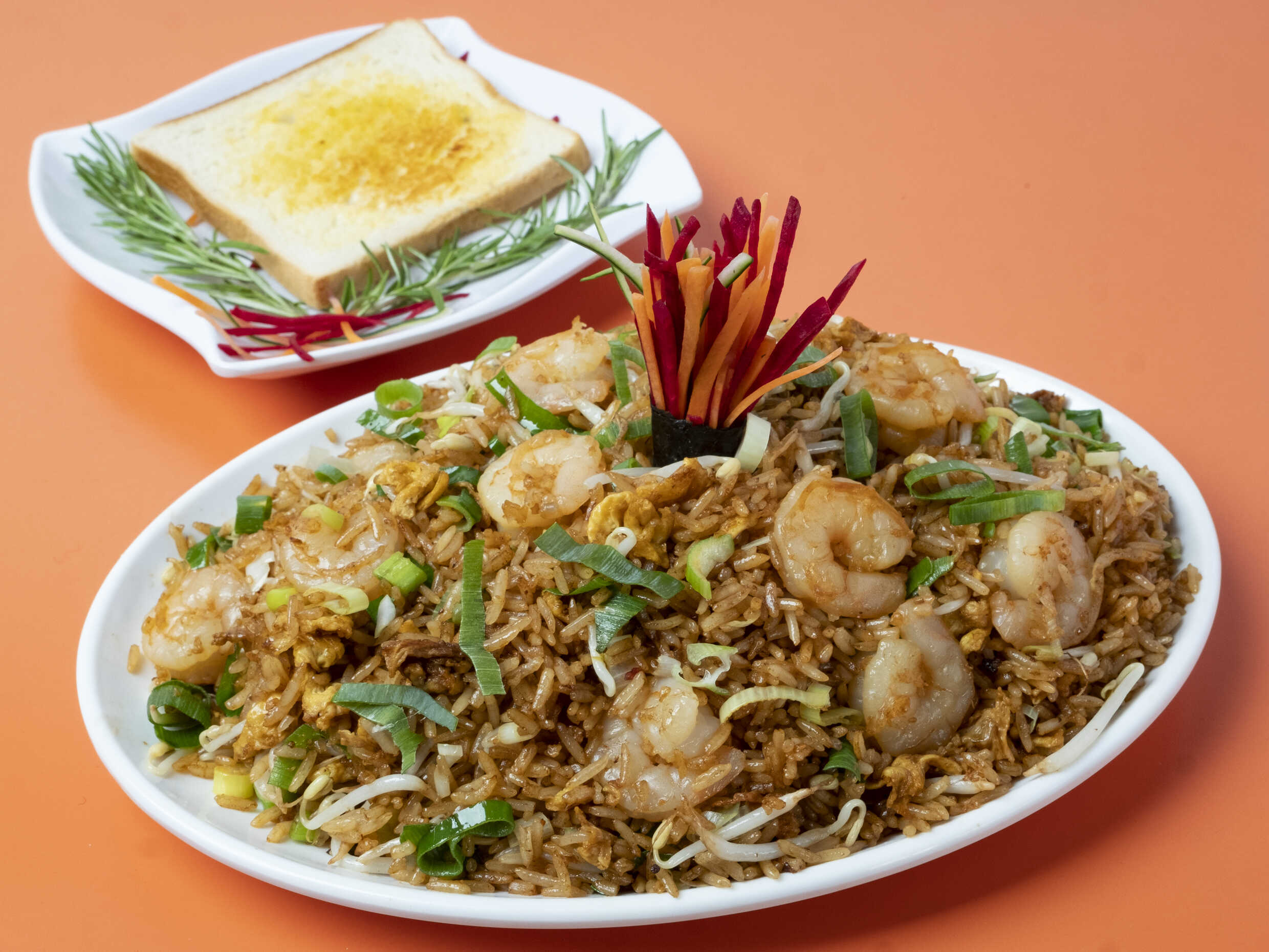 Arroz Cantonés con Camarones, huevo, cebollín y frijol nacido.