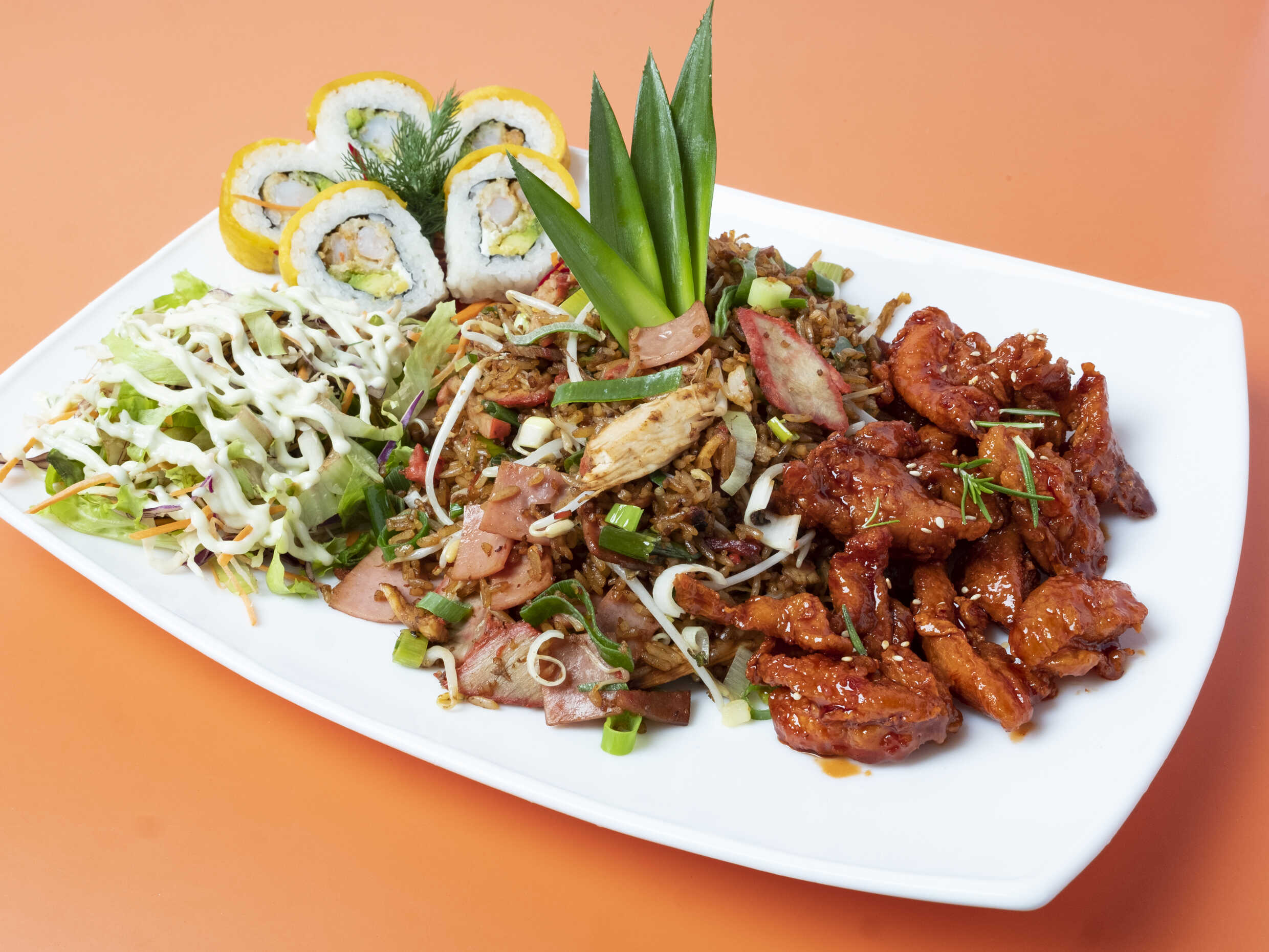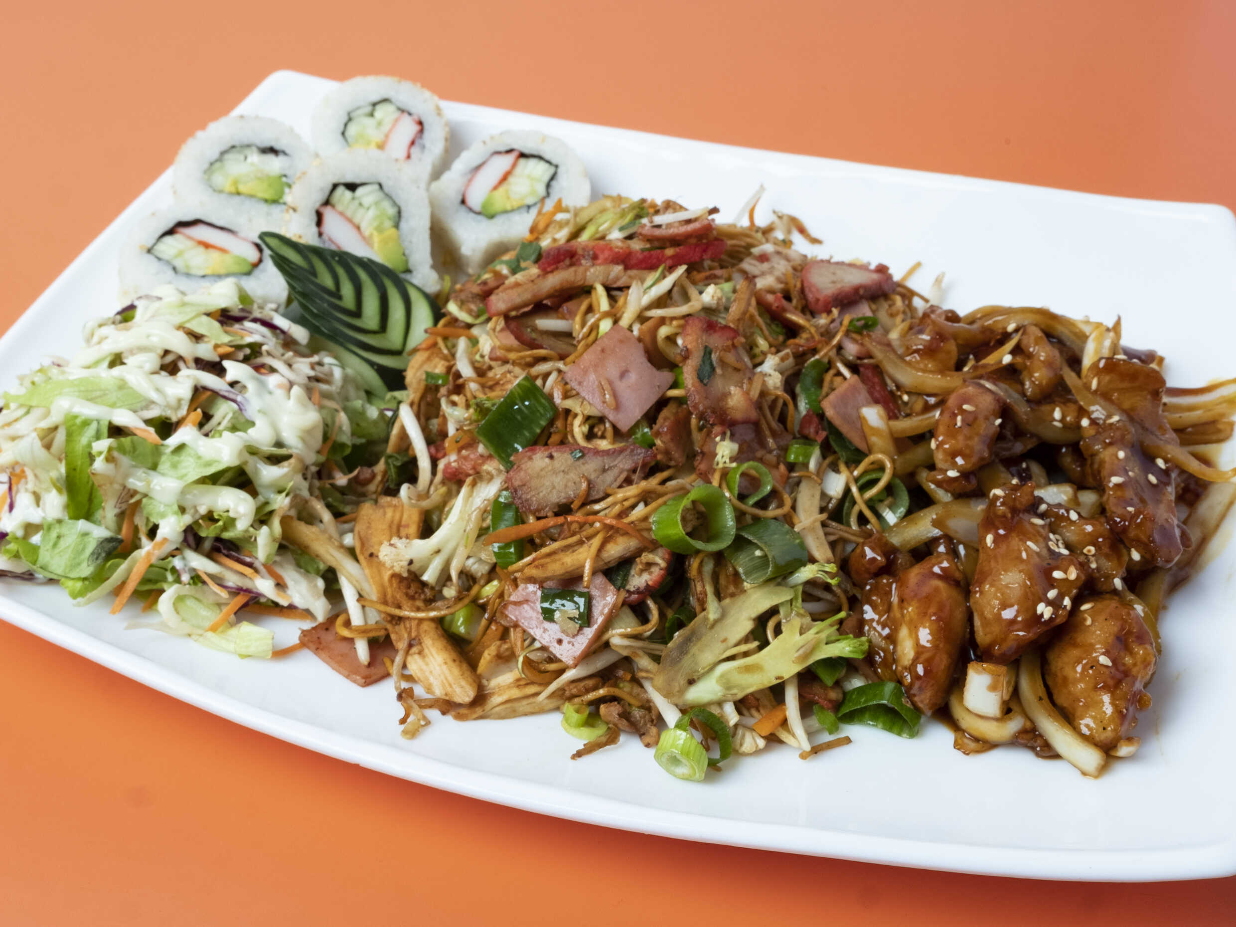 Delicioso Chop Suey en salsa o seco con Ensalada de pollo teriyaki, Acompañado de 5 piezas de Sushi Roll California