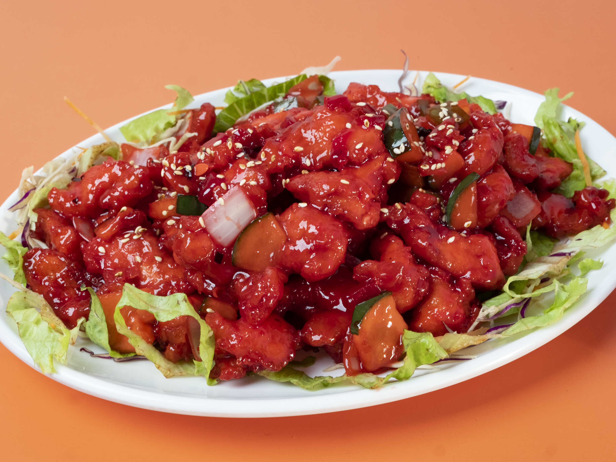 Pollo en Salsa agridulce con cebolla, piña, chile dulce y pepino.