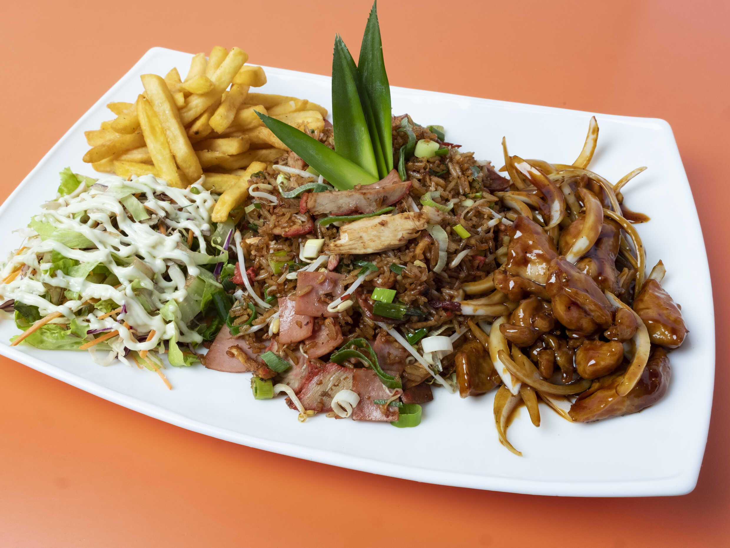 Delicioso Arroz cantonés con Pollo en salsa a elegir entre agridulce o a la naranja Acompañado de 5 piezas de Maduro Roll
