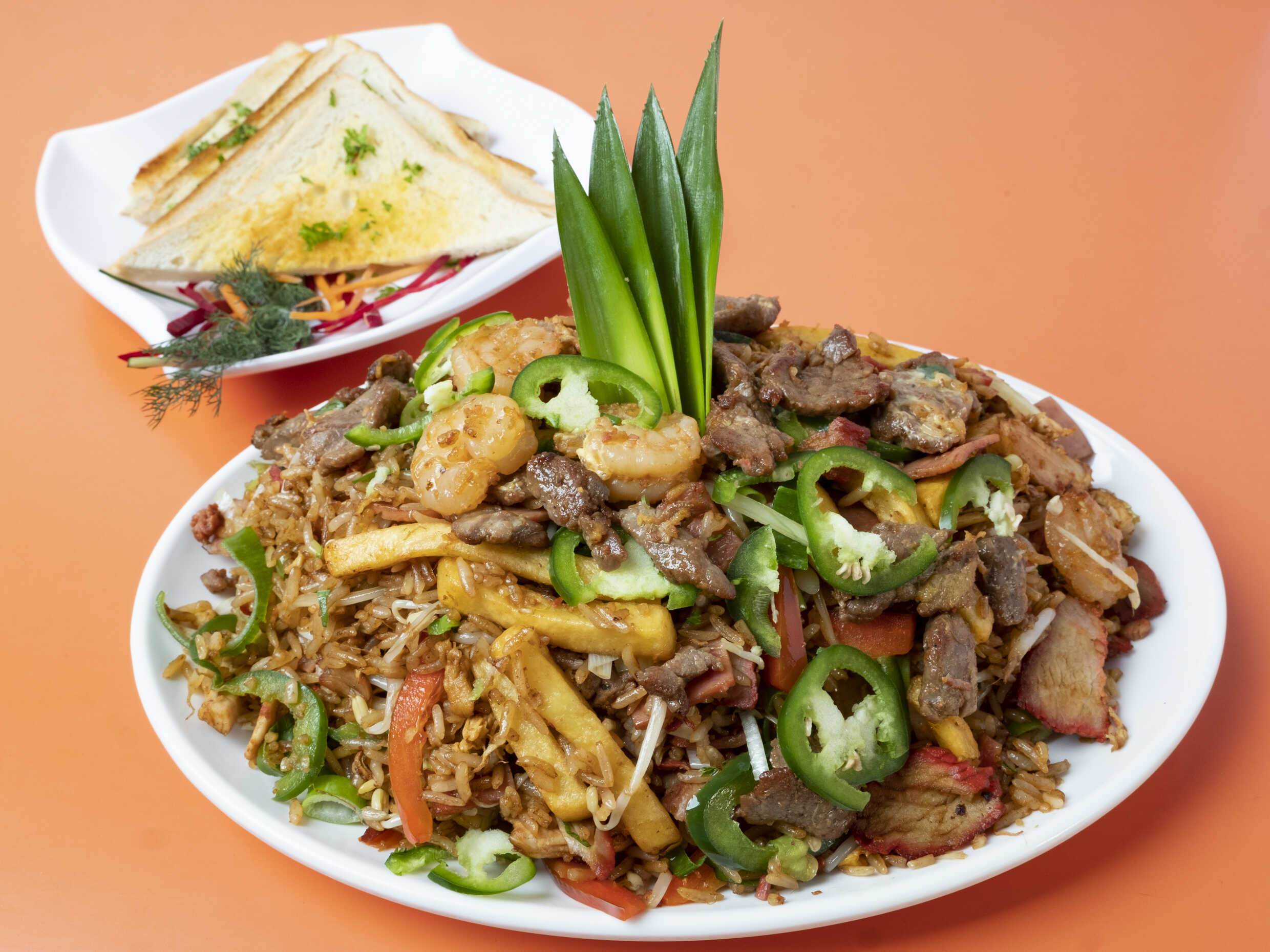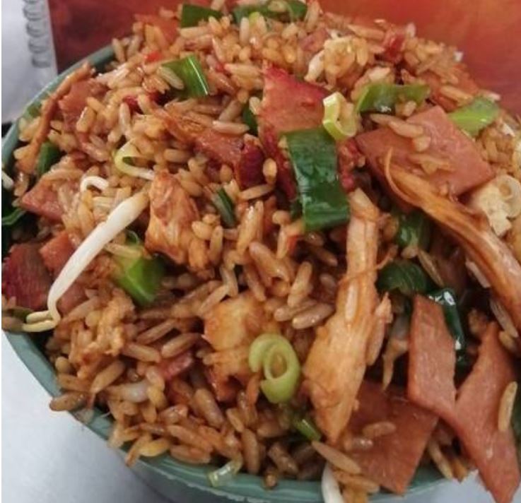 Arroz Cantonés con pollo, jamón, lechón, camarón, carne de res, cebolla, chile dulce, papas, jalapeño, huevo, cebollín y frijol nacido.