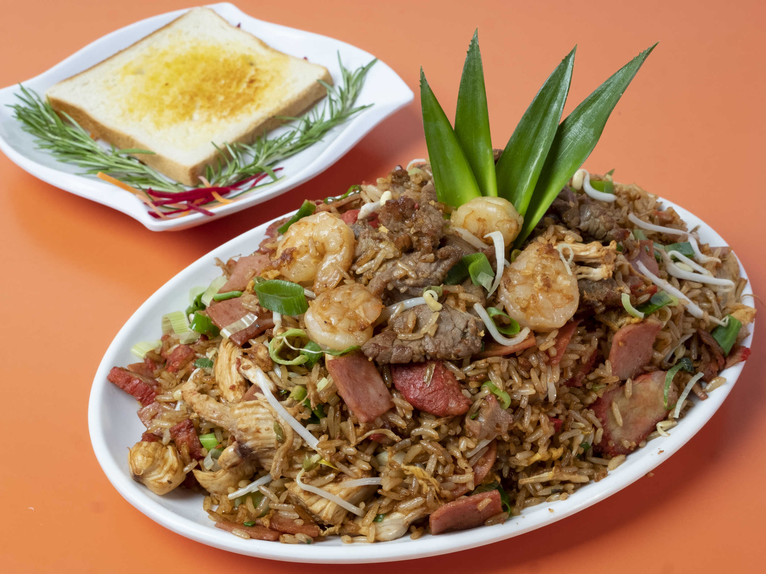 Arroz cantonés con pollo, jamón, lechón, carne de res, camarón, huevo, cebollín y frijol nacido.