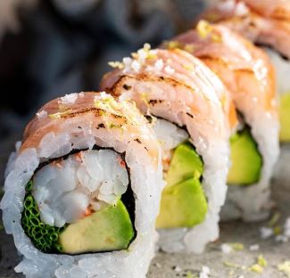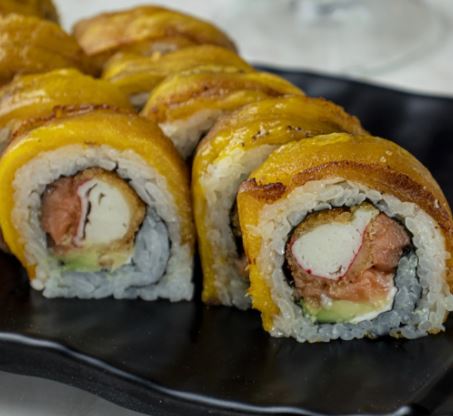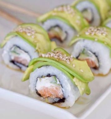 Salmón, aguacate, queso crema, topping de surimi
