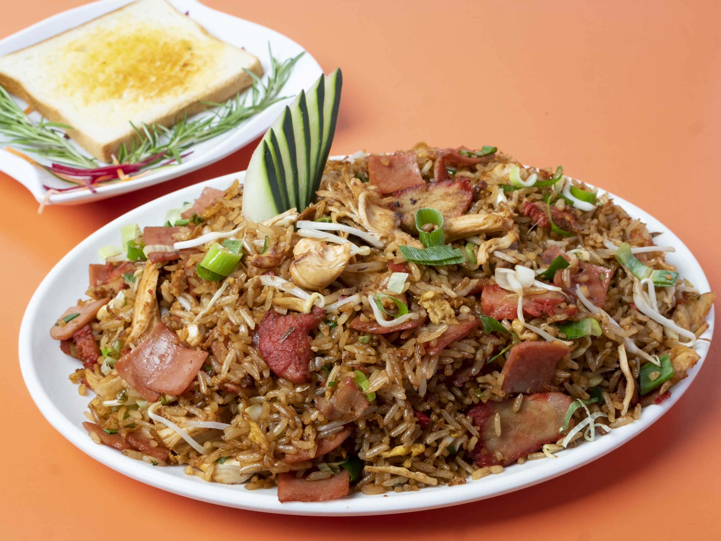 Arroz Cantonés con Lechón Asado, huevo, cebollín y frijol nacido.