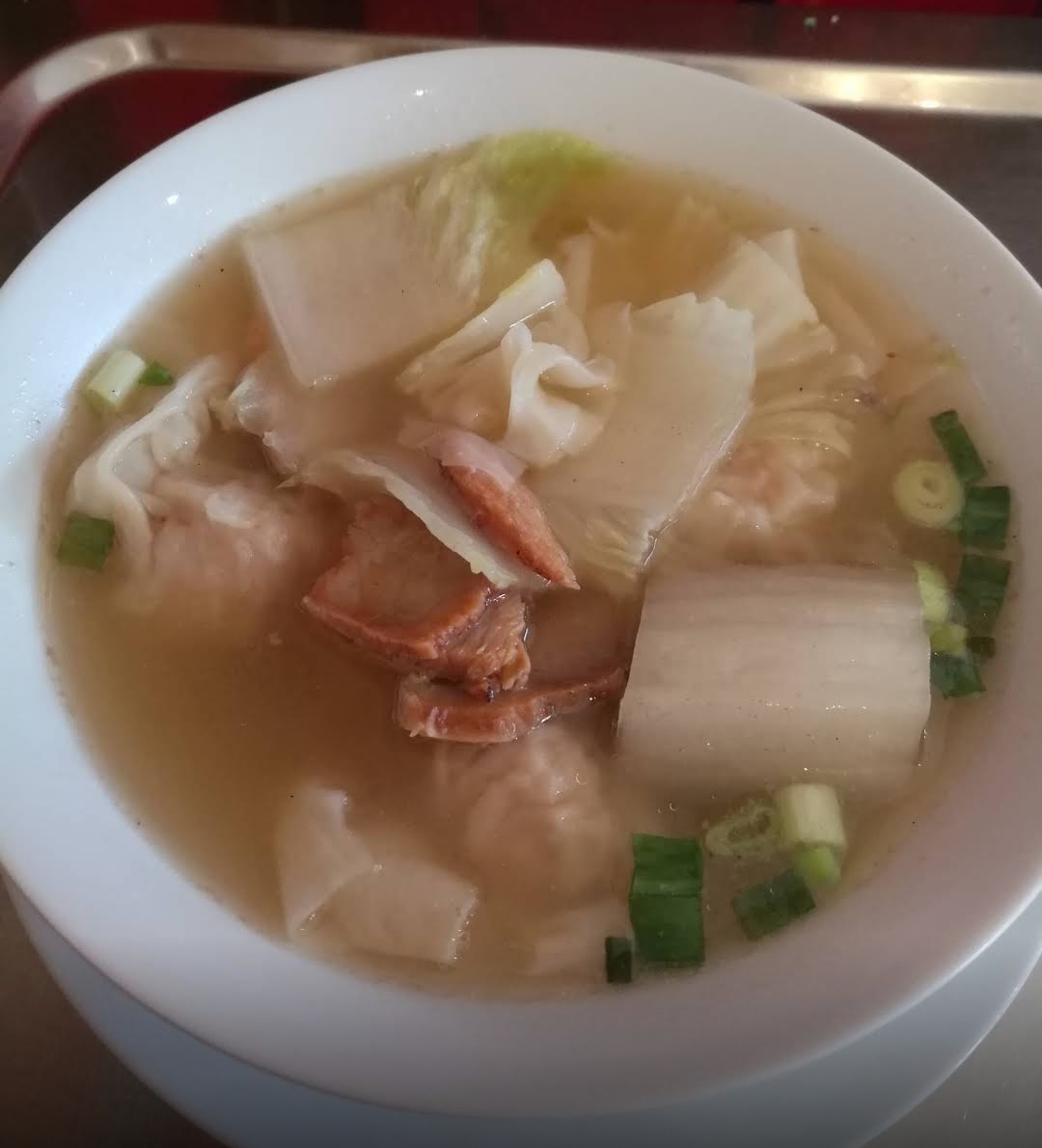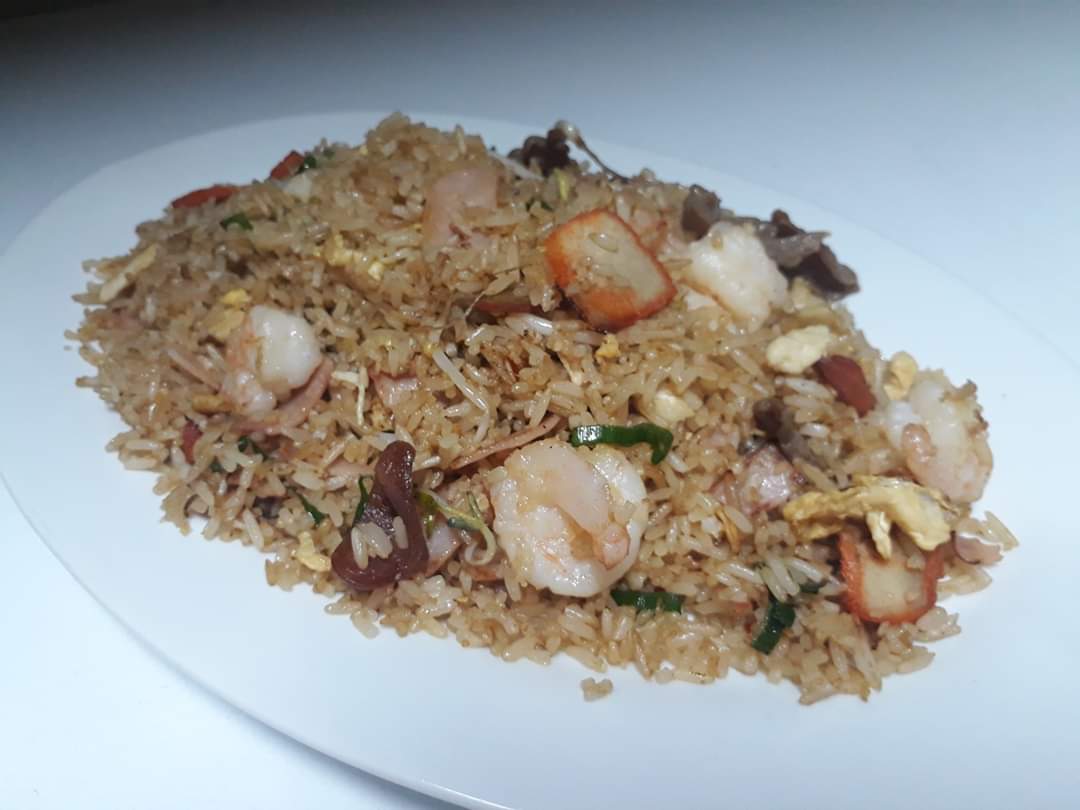 Pollo, jamón, chorizo chino, lechón, carne de res y camarón mediano.