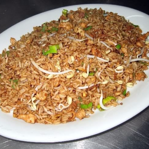 Camarón, lechón, huevo, cebollín, chile, zanahoria, frijol nacido y condimento curry.