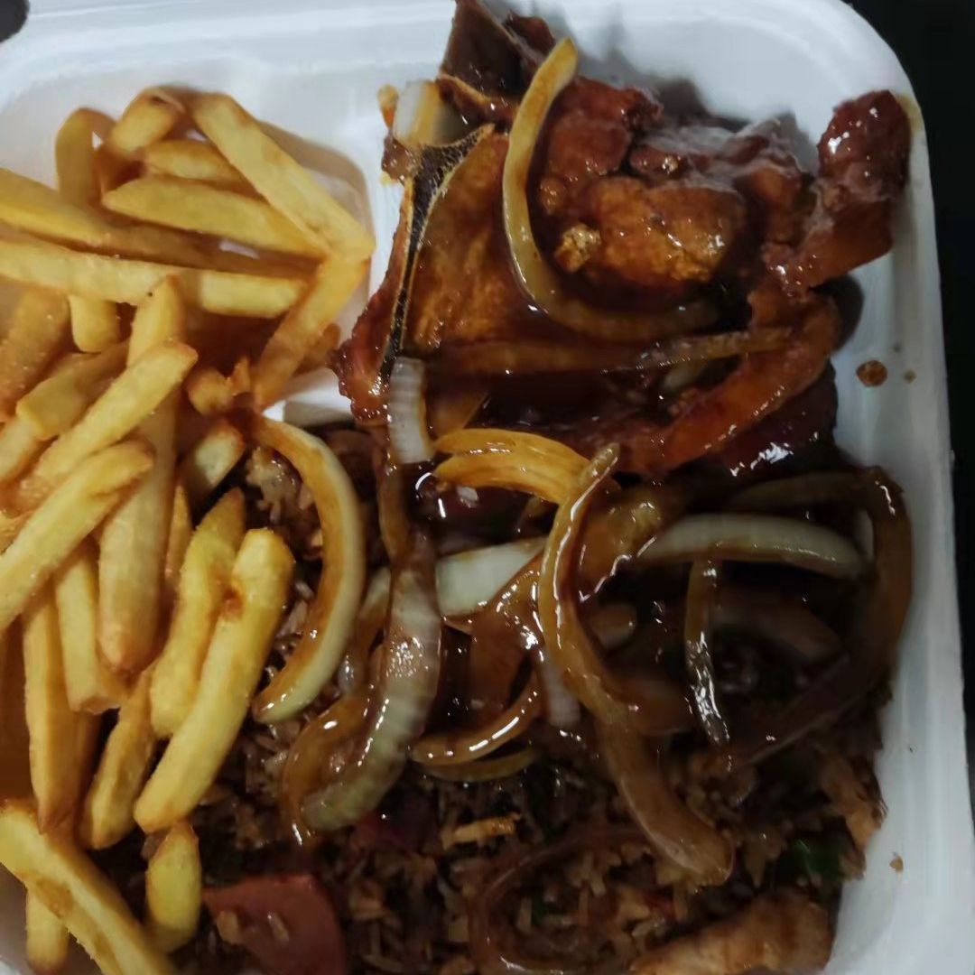 Arroz Cantonés con Bistec Encebollado 牛扒