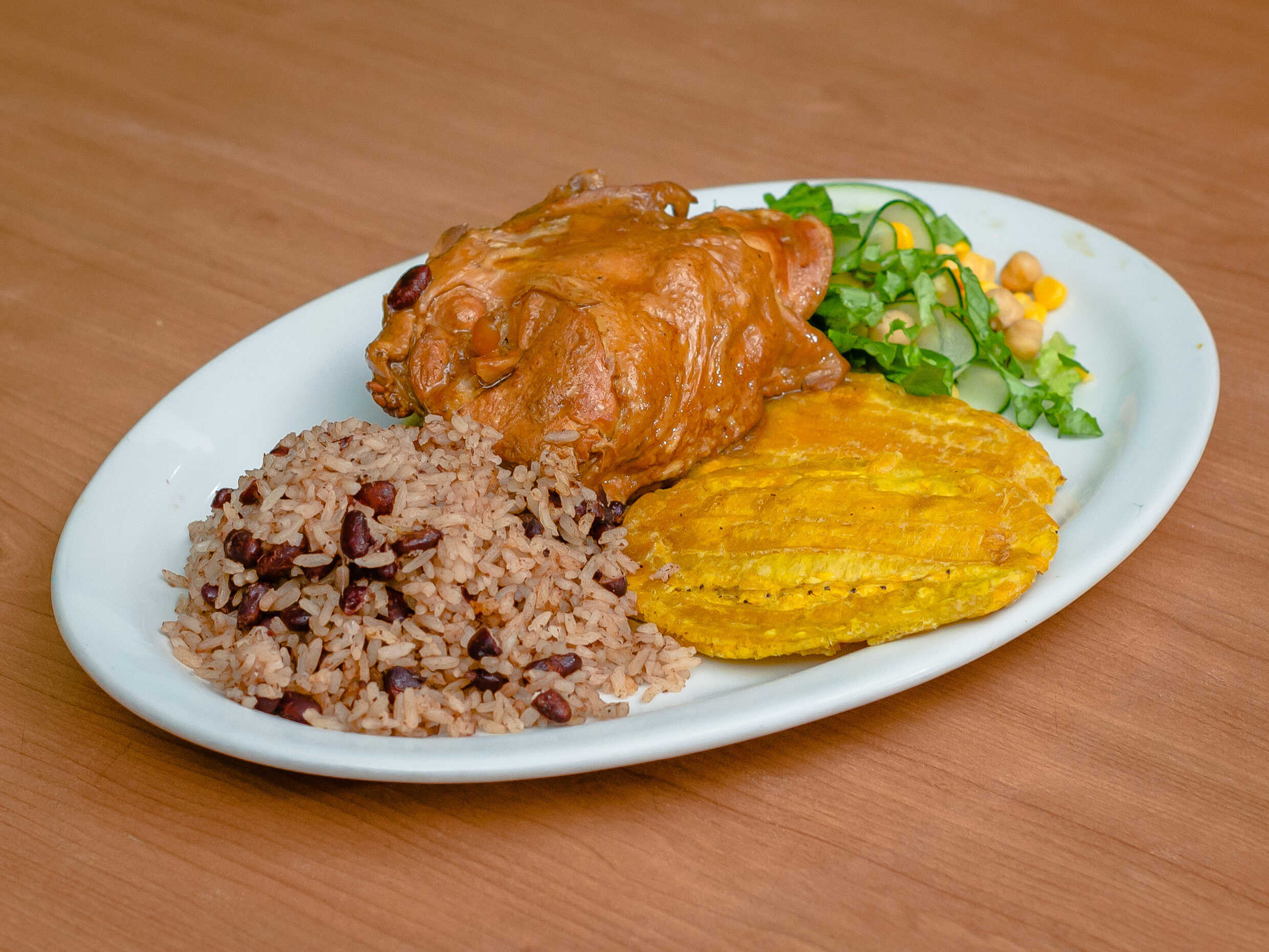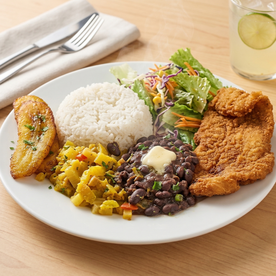 Platillo individual; lleva una porción de arroz, ensalada y patacón o maduro, con el mejor sabor caribeño, elige tu proteína y acompañamiento, incluye bebida de 12 onzas a elección entre limonada, agua de sapo o poche 🌴🍚🥤😊