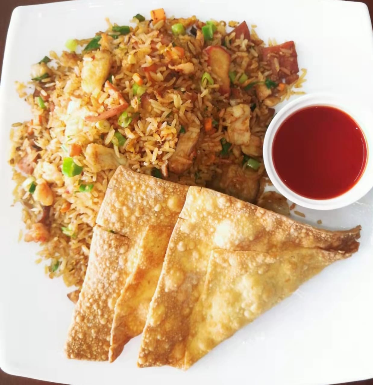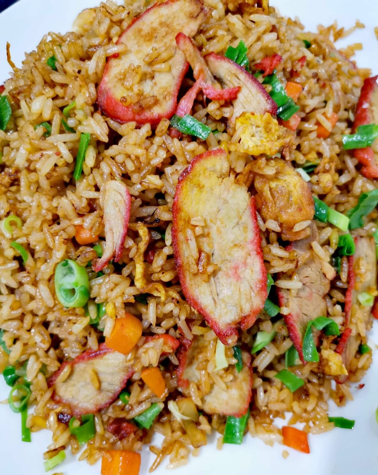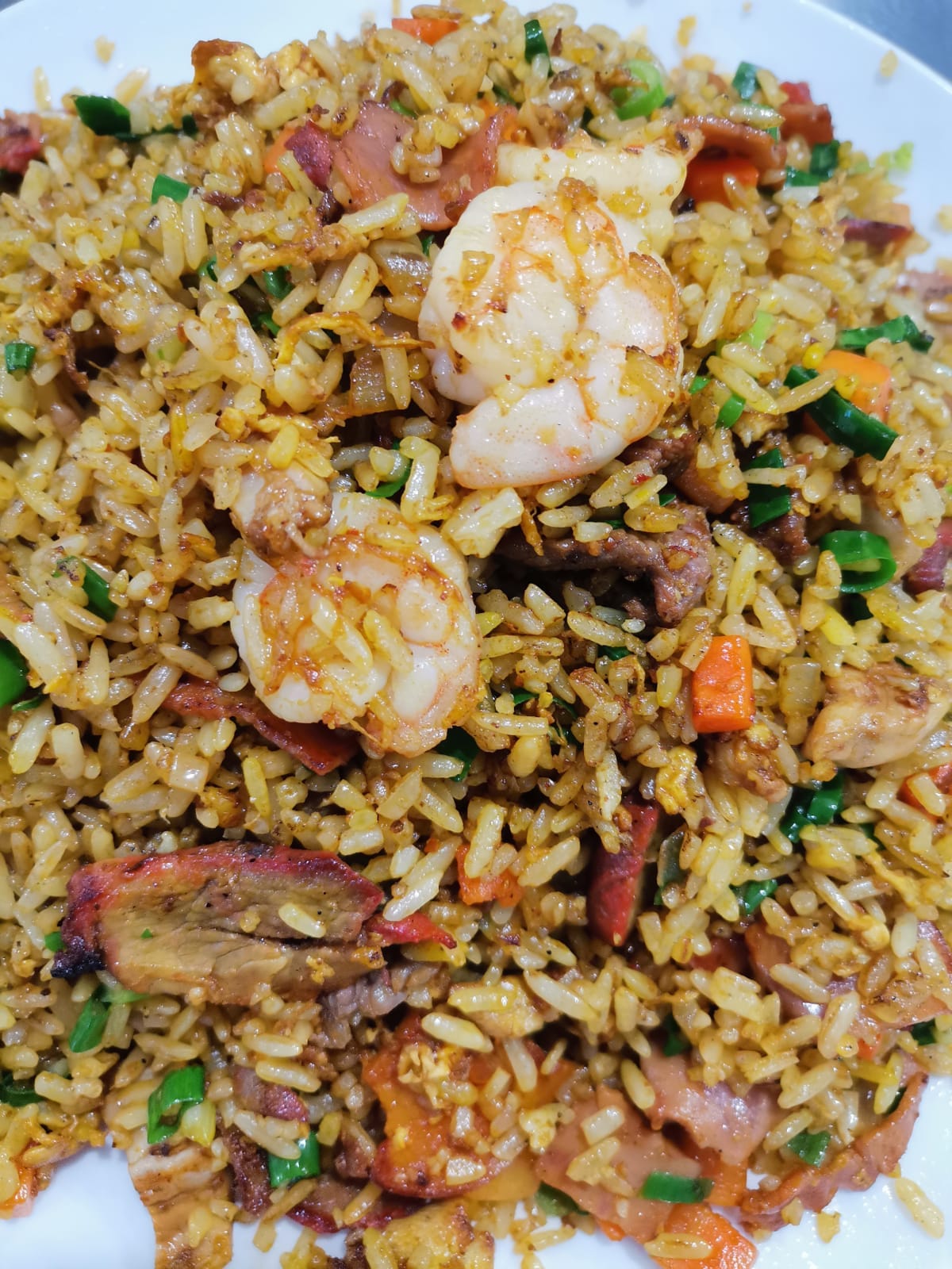 Con res.pollo, lechón, jamón, chorizo chino y camarones.