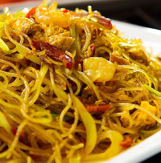 fideo de arroz chino con camarones.lechon en curry